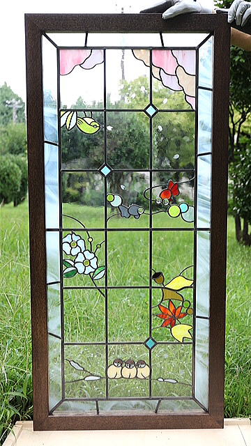 ![]() 完成した作品の写真を送っていただきました。 上から下へ流れるように春夏秋冬が描かれています。 アンティーク調のガラスも素敵な作品ですね〜。 |
