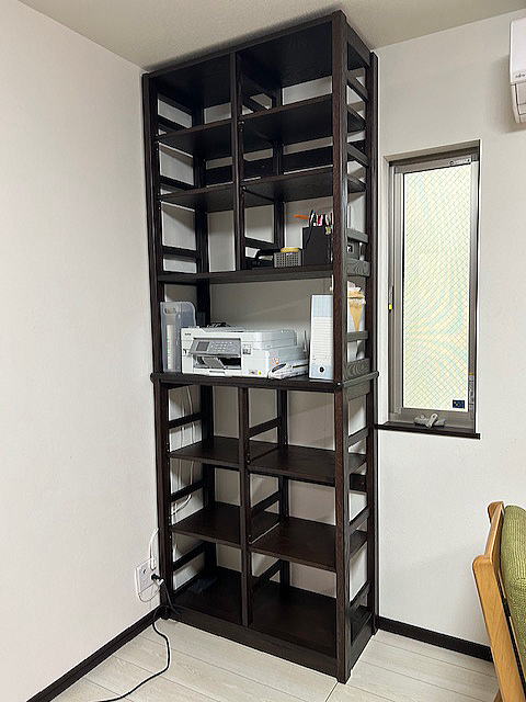 ![]() 固定棚、可動棚ともに収納される予定のものに合わせて お客様と打ち合わせ、寸法を決めて製作いたしました。 仕上げは着色ウレタン塗装です。 |