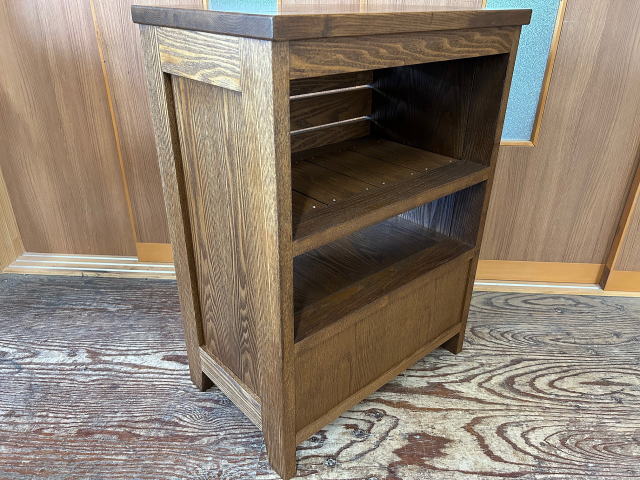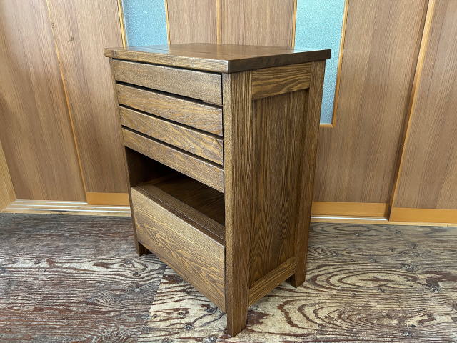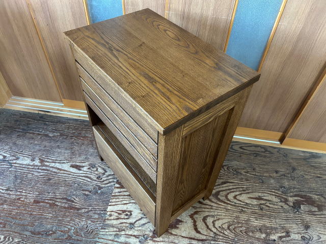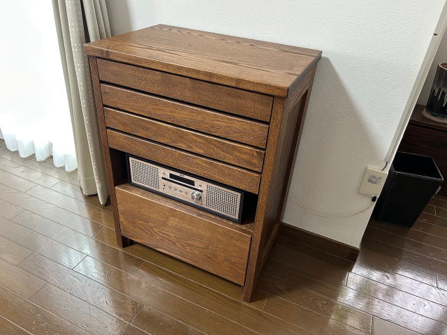 ![]() 最上段の部分はモデムやルーターお収納します。 前面は扉ではなく塞いで欲しいとのご要望で、4枚の板で塞ぎました。 中央開口部分にはCDプレイヤーを収納します。 一番下は、引出しになっています。 |