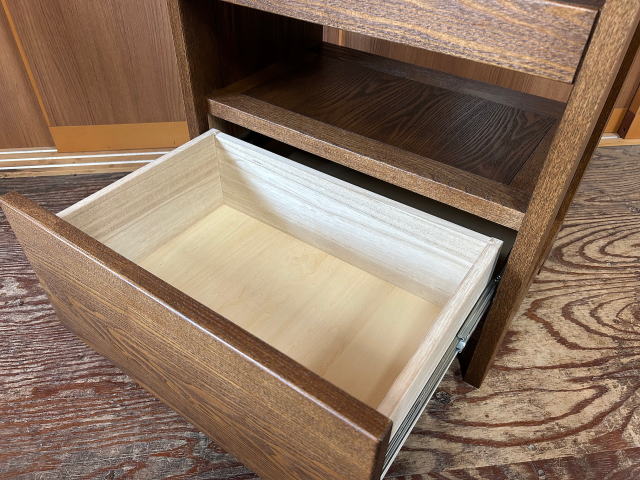 ![]() 裏面は、引出し部分以外は開放となっています。 モデムやルーターはこちら側から収納します。 引出しの裏板にはタモ突き板を使用しました。 |